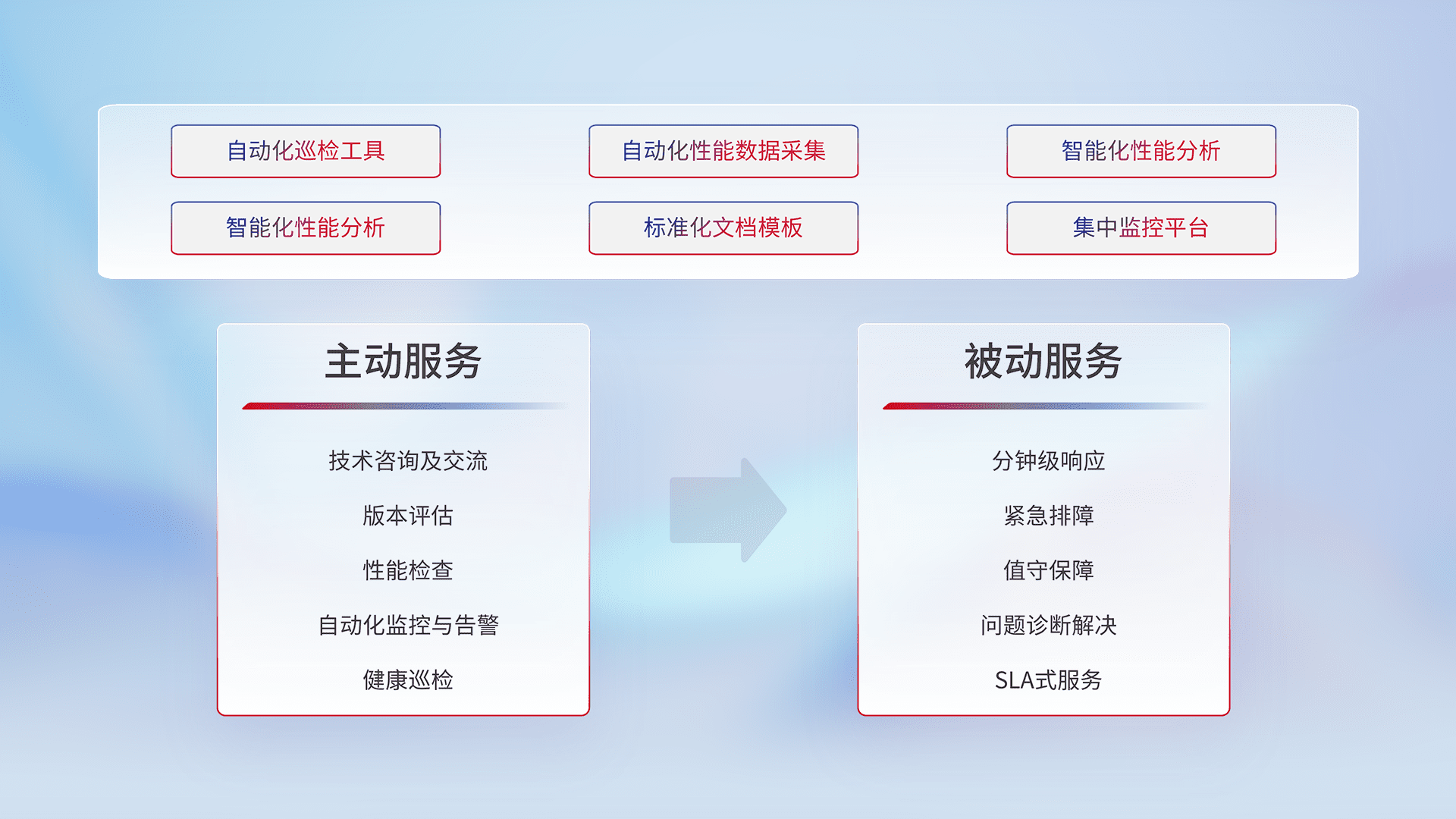 智能化工具和标准化文档,,,,保障服务质量,,,提供主动服务(包含技术咨询、、版本评估、、、性能检查、、、自动化监控与告警、、健康巡检)和被动服务包含(分钟级响应、、、紧急排障、、、、值守保障、、、问题诊断解决、、、、SLA服务)。。