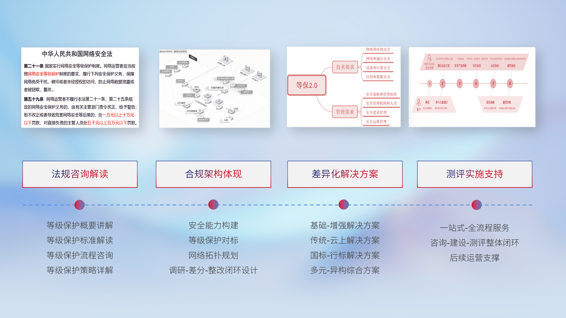 通过专业的法律咨询解读、、合规架构体现、、、、差异化解决方案、、、测试实施支持等服务,,为客户量身打造等保合规体系。。。
